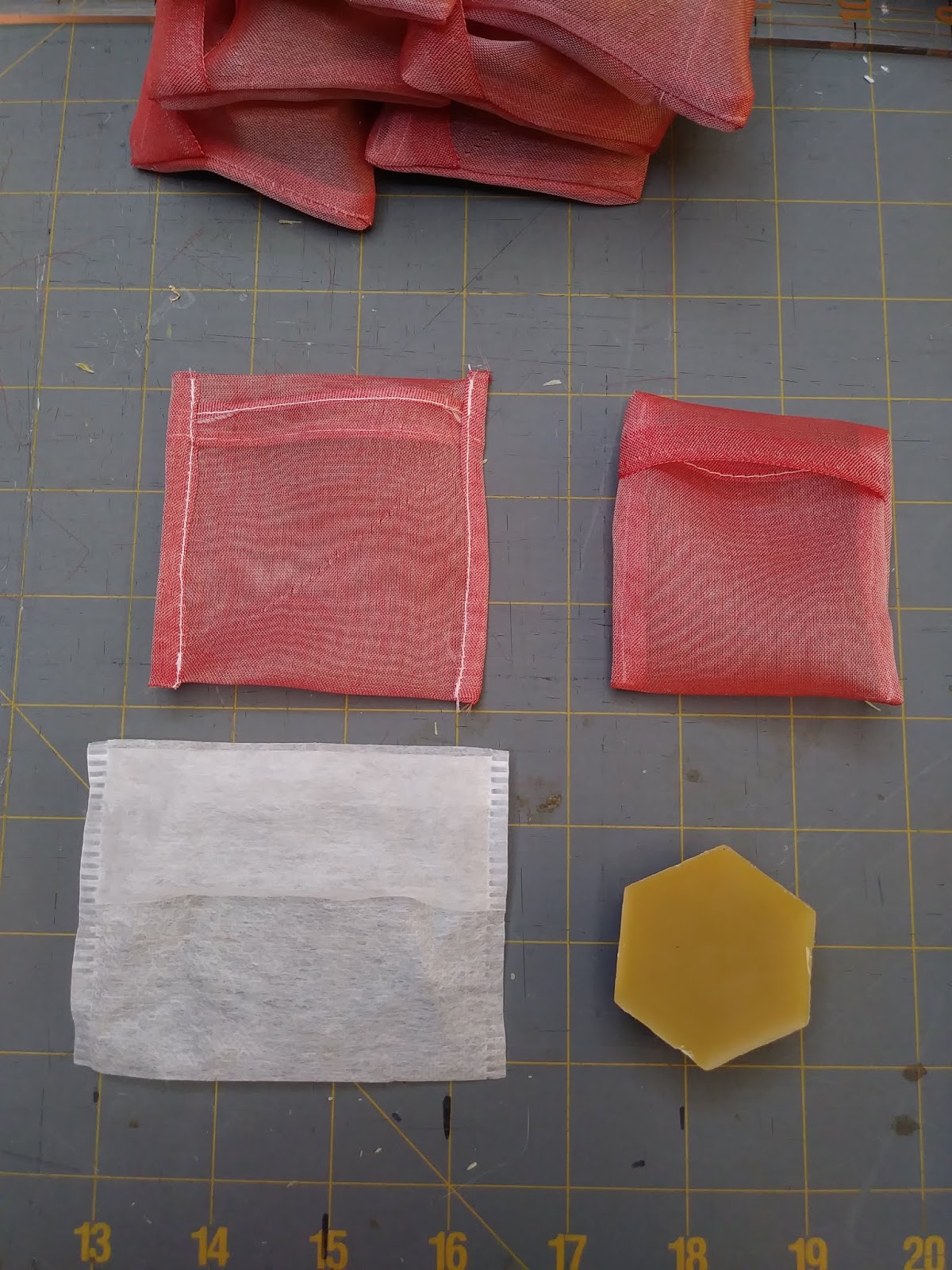 Beeswax and pouchThe wax hexagons are from a friend who keeps bees. To protect the wax from lint, and to protect the rest of the contents of the kit from wax, I wanted a little pouch to keep it in. A reusable/disposable tea bag was about the right size, so I copied it (tweaking the dimensions) out of a silk organza. I wanted a thin fabric that wouldn't add a lot of bulk, and I wanted a stiff fabric that wouldn't cling to the wax while inserting and removing it. I happened to have a remnant of rose-colored silk organza with an intact selvedge edge, which cut down on my narrow hems in disobedient fabric. (Silk organza is kind of a nightmare to work with)